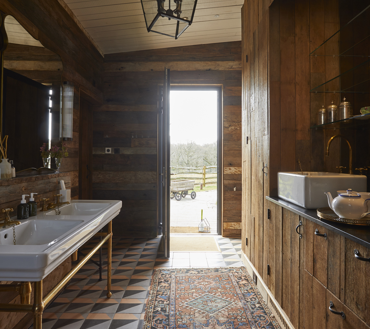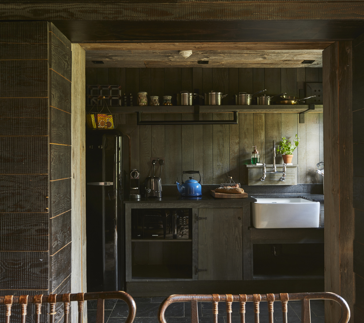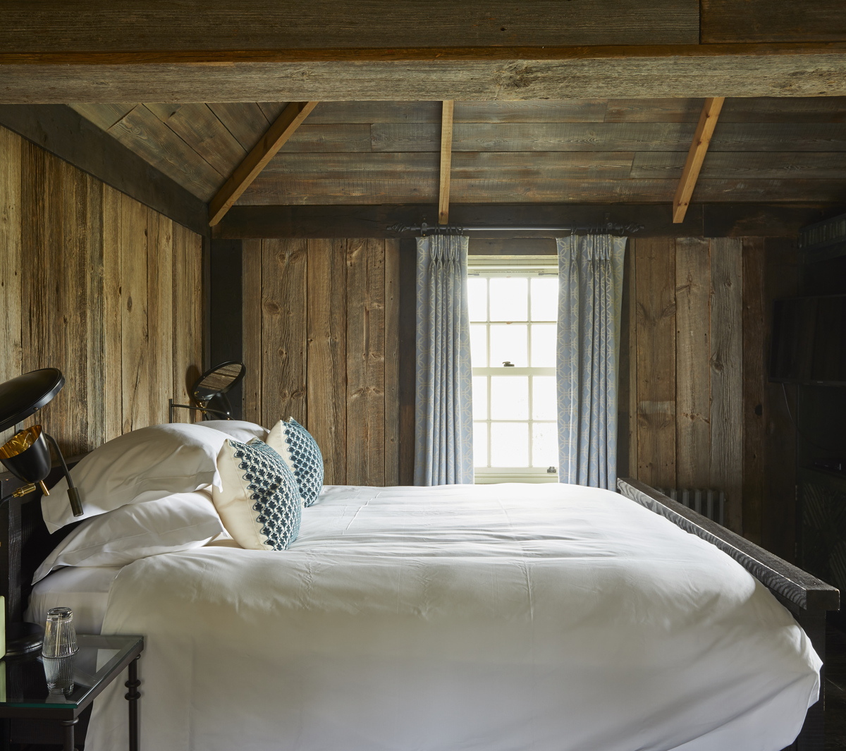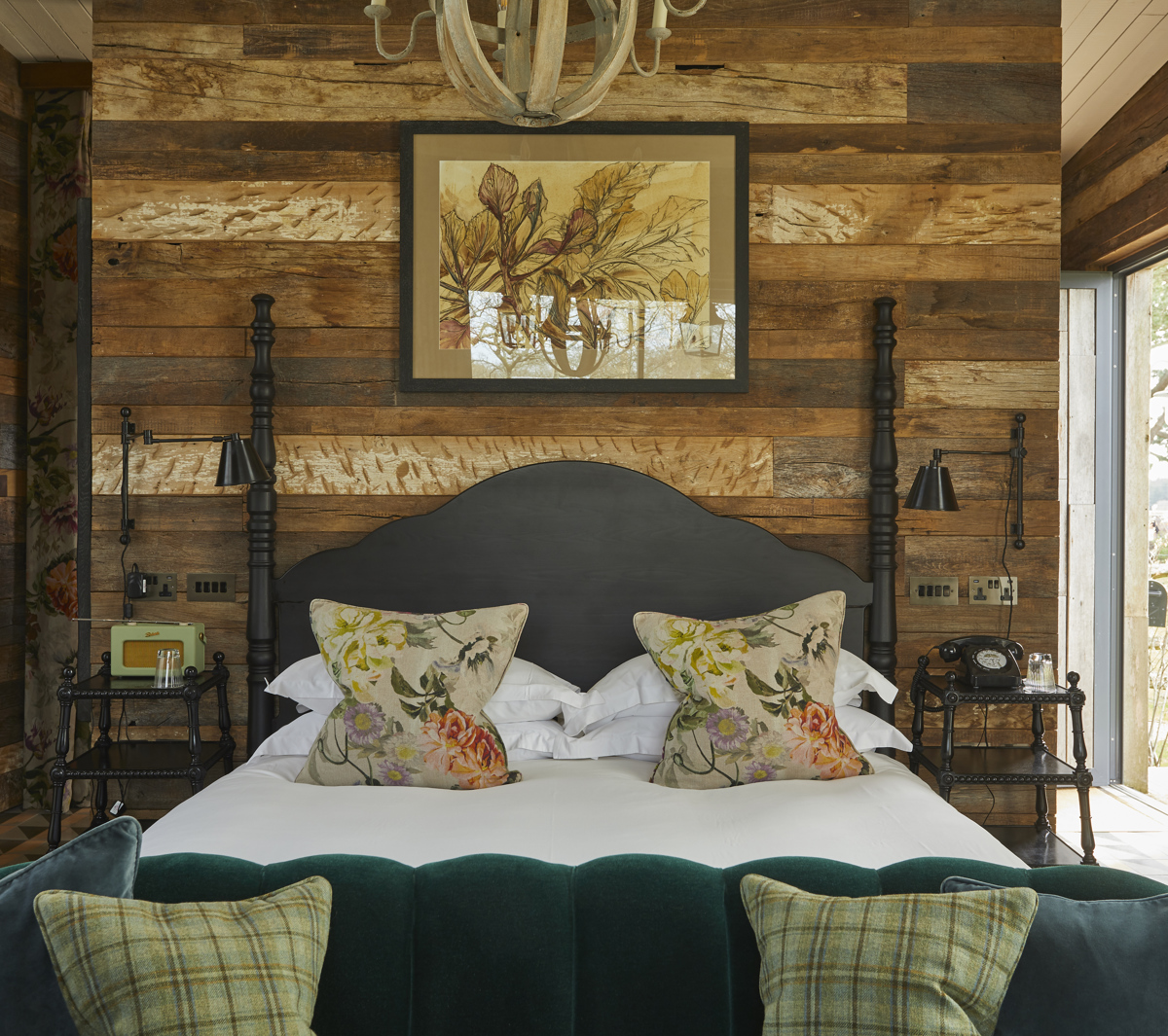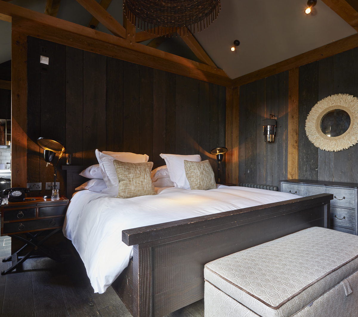 The Lake Cabin is simple but sophisticated - the interior has stripped wood floors and walls, a super king-sized bed and en-suite bathroom with full bath, walk-in shower, a separate wash closet plus a mini bar area.