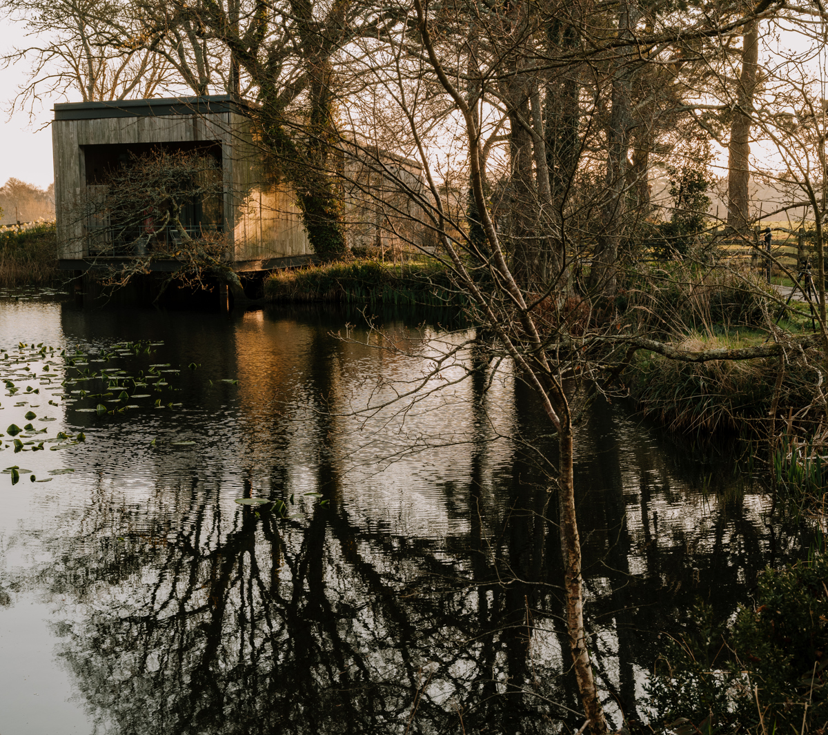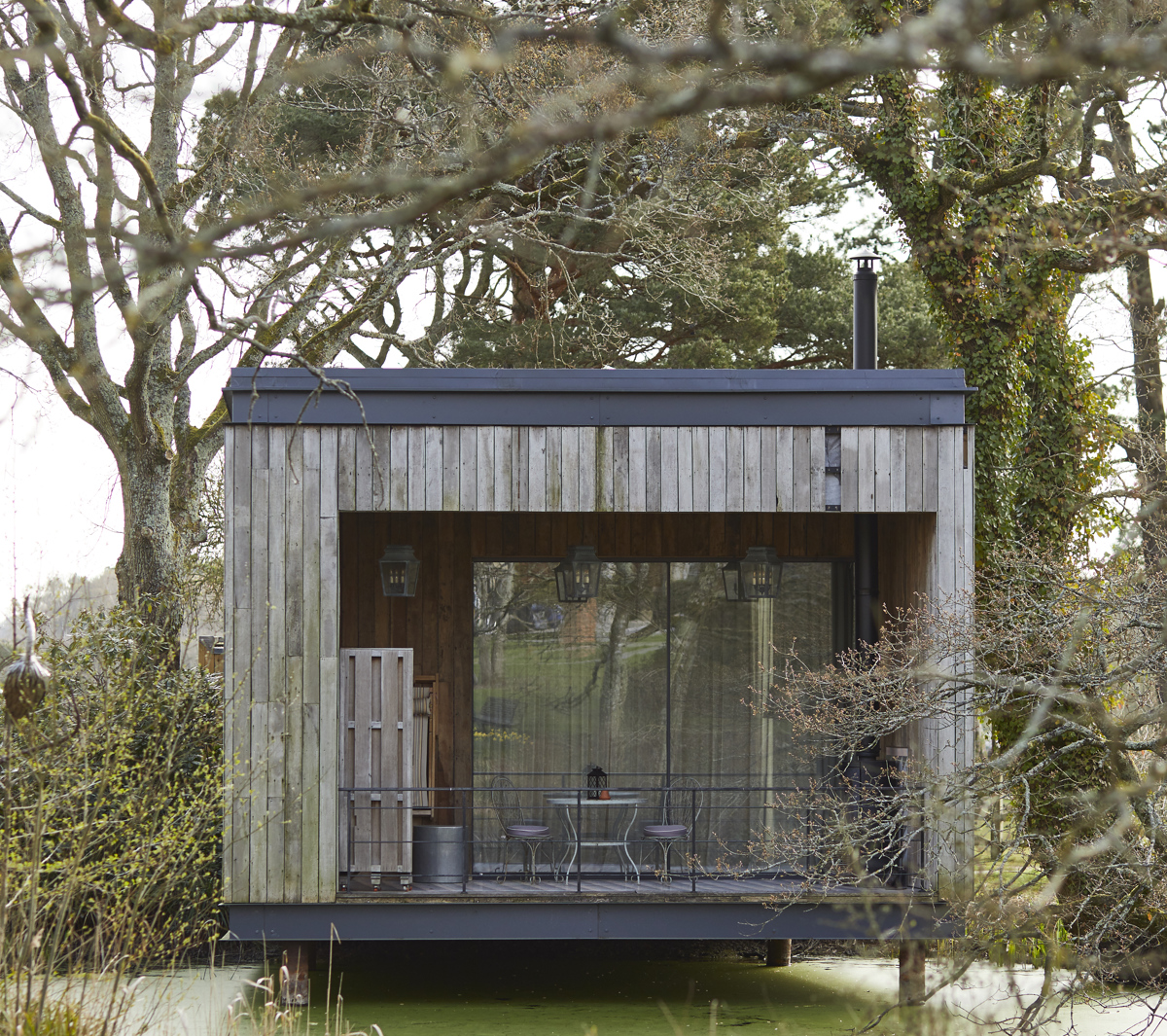 The Lake Cabin is definitely for romantics - with a living sedum roof, clad in reclaimed timber inside and out, the cabin is true to its name and is cantilevered out over the lake giving a sense of floating on water which surrounds its balcony overlooking the lake.