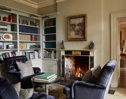 Libraries are always conducive to good thoughts. Ours is too, but it's also a comfortable and chic retreat and is particularly well-suited for small informal conversations. There is a working open fireplace and beautiful bay window looking onto the gardens beyond.