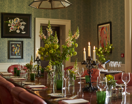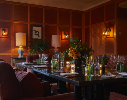 Overlooking the Lime Wood gardens, this private room has a floor to ceiling large bay window with access onto the South Terrace. Perfect for private dining or board room style meetings!