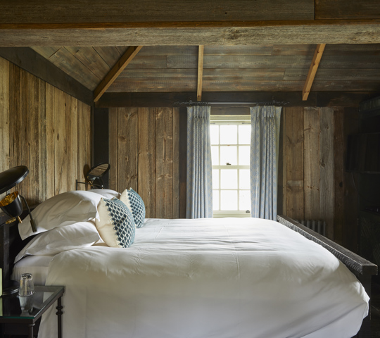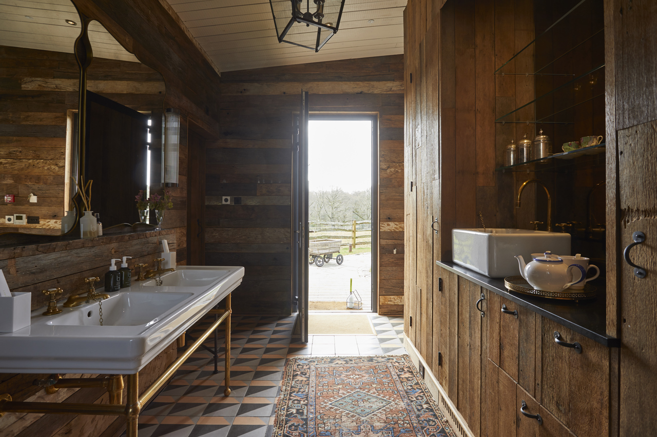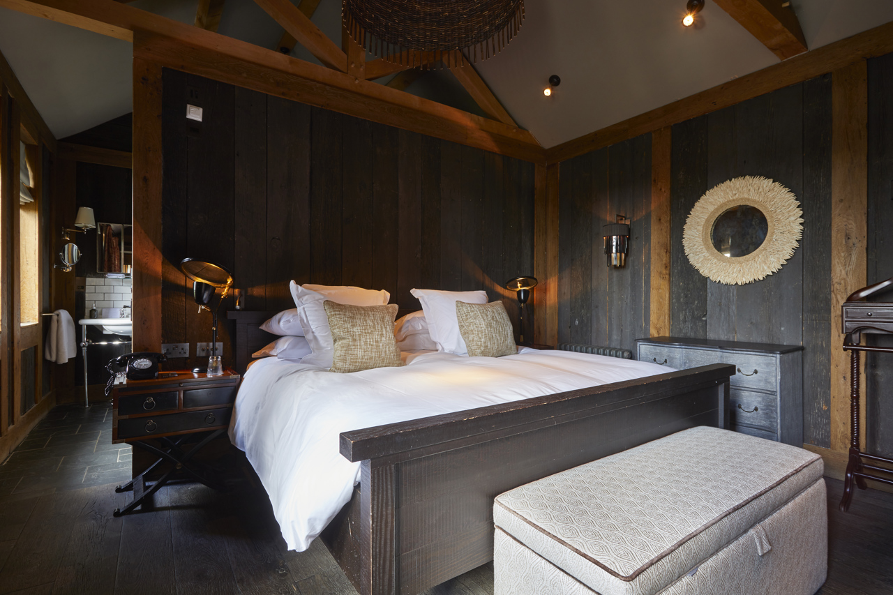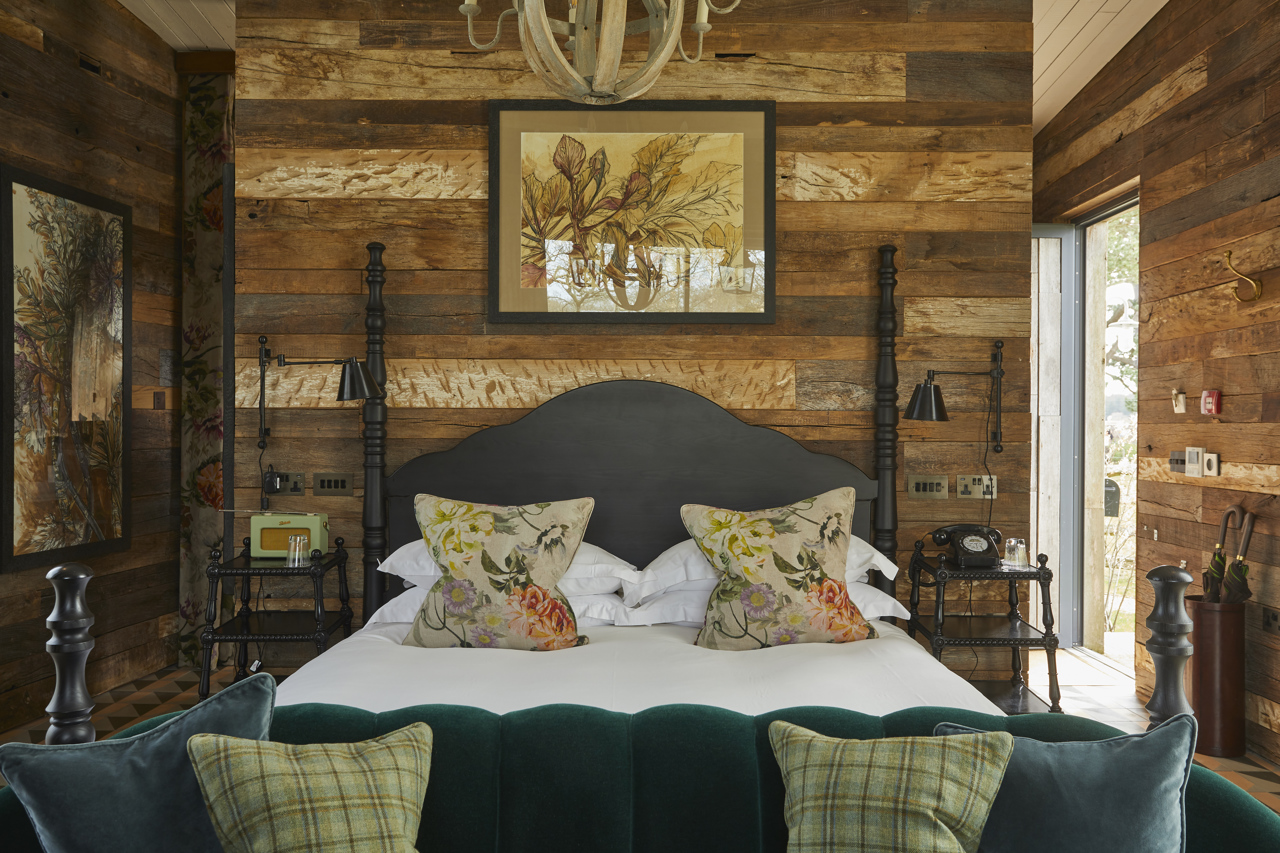 The Lake Cabin is simple but sophisticated - the interior has stripped wood floors and walls, a super king-sized bed and en-suite bathroom with full bath, walk-in shower, a separate wash closet plus a mini bar area.