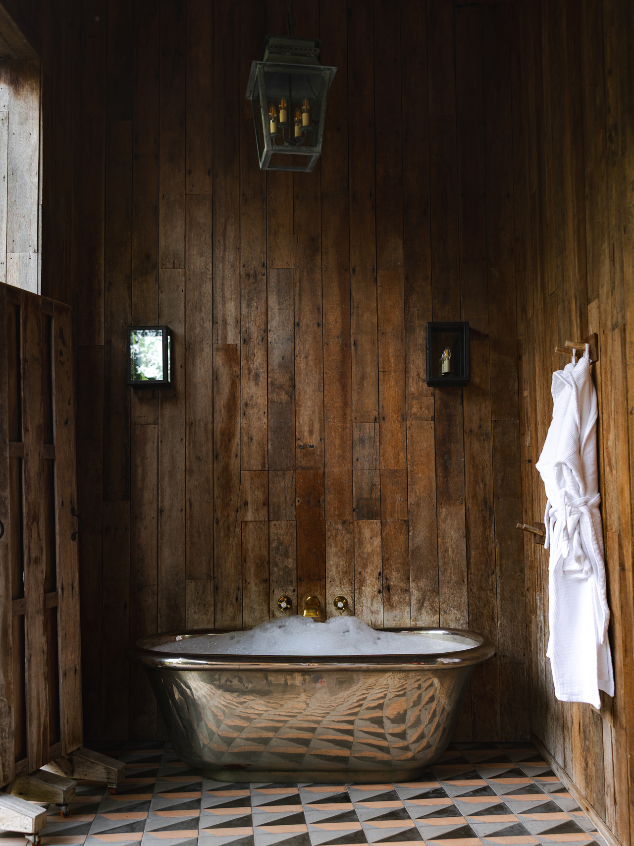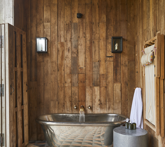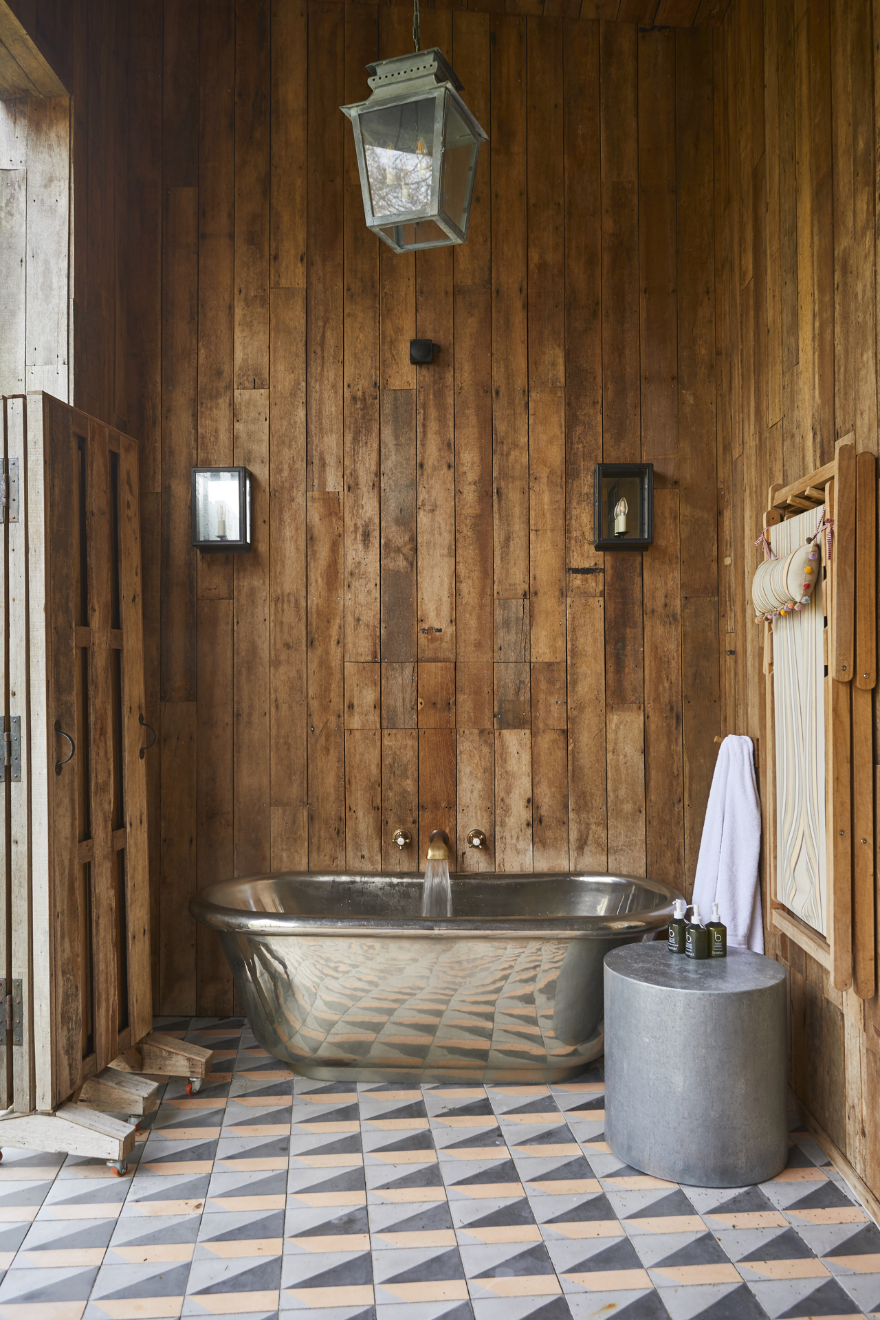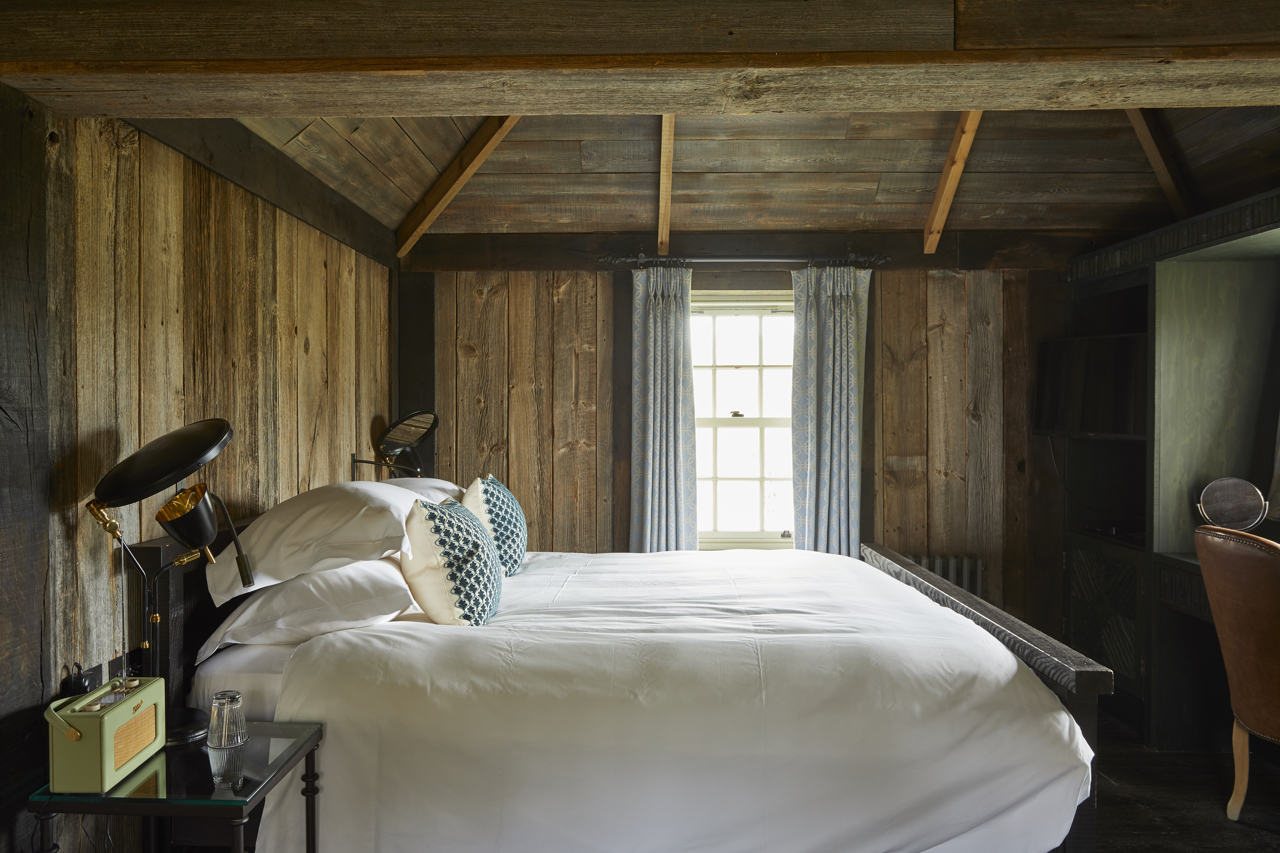 The Lake Cabin is simple but sophisticated - the interior has stripped wood floors and walls, a super king-sized bed and en-suite bathroom with full bath, walk-in shower, a separate wash closet plus a mini bar area.