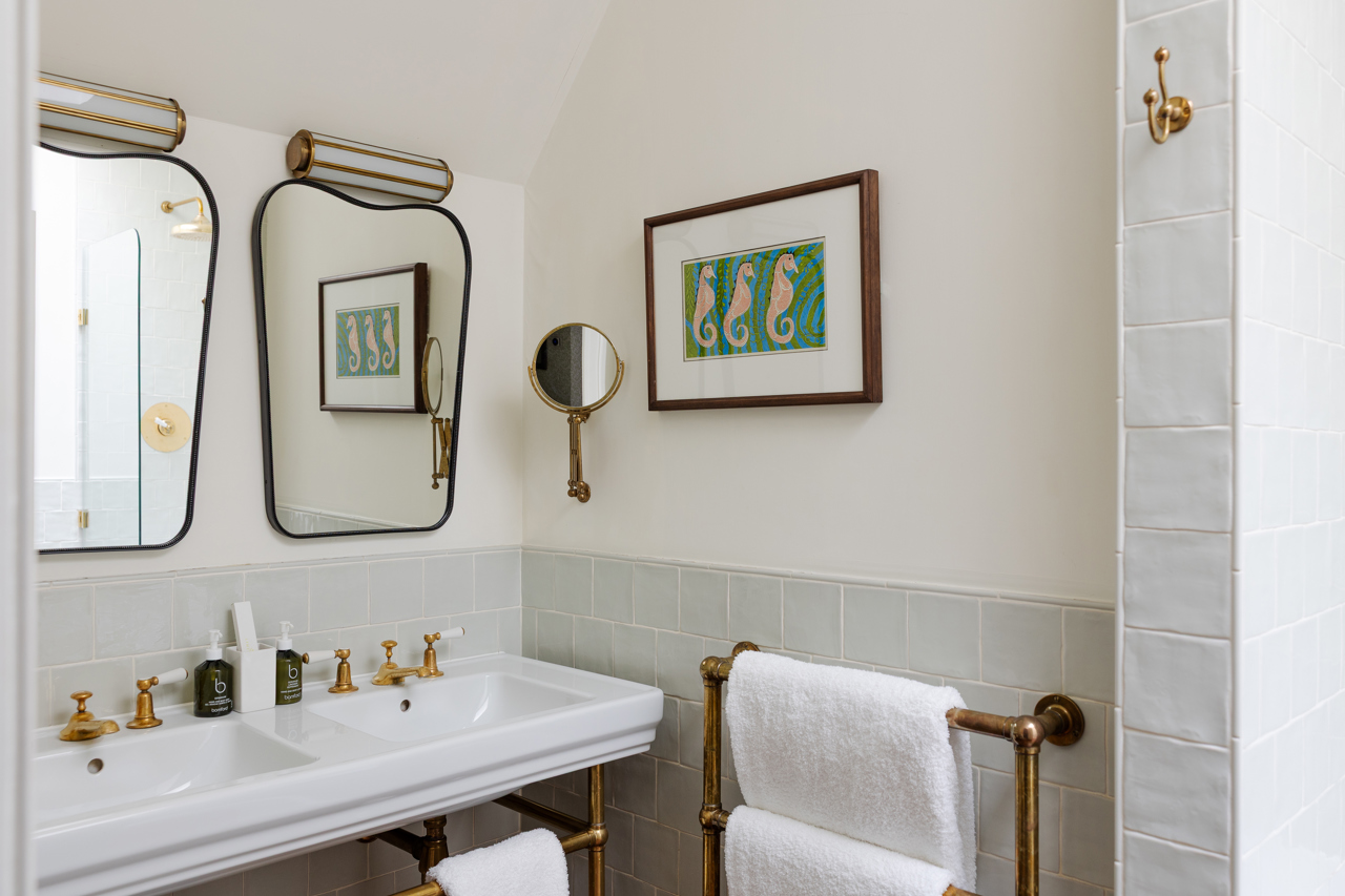 Comfortable bedrooms with super king-sized beds, overlooking the lawns, fields, gardens, and the forest beyond. Bathrooms feature fitted bathtubs with overhead showers and double basins.