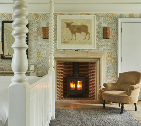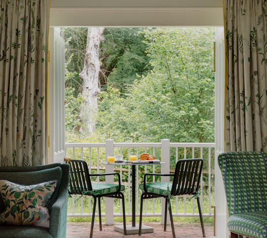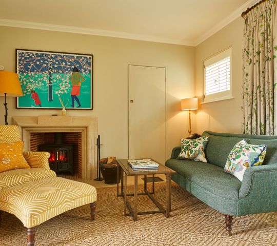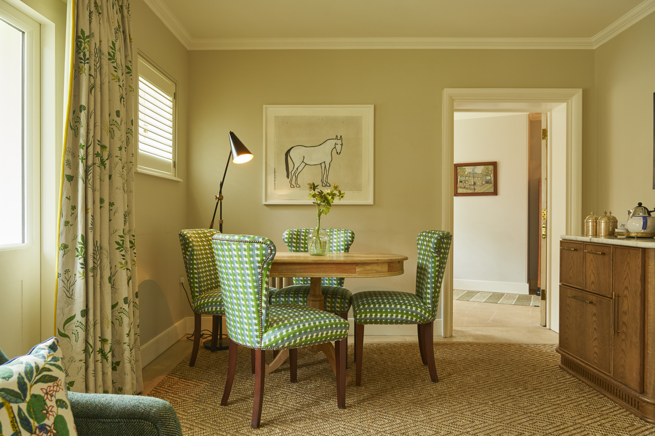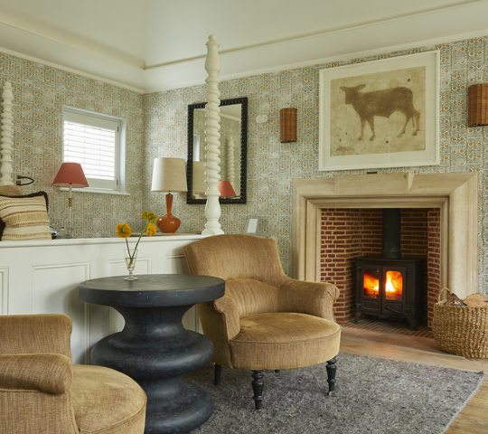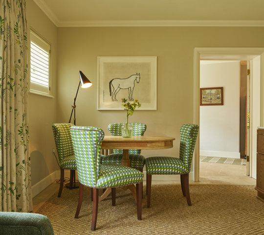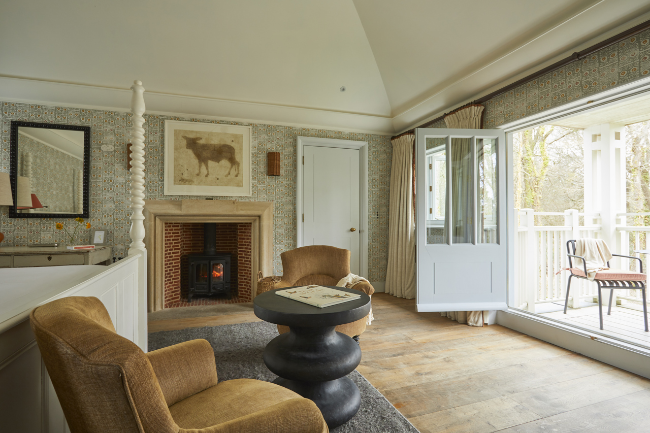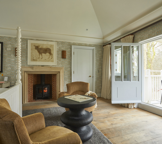 This is one of our most extensive and indulgent suites. Designed over two floors, Crescent Three has a master bedroom with a super king-sized bed and small balcony looking out over the forest and a large bathroom with a roll-top bath and monsoon shower. Downstairs is a lounge with a dining area, cosy fireplace and a private forest terrace, as well as an additional single bedroom. Designer Susie Atkinson used eclectic fabrics and pops of colour in her design.