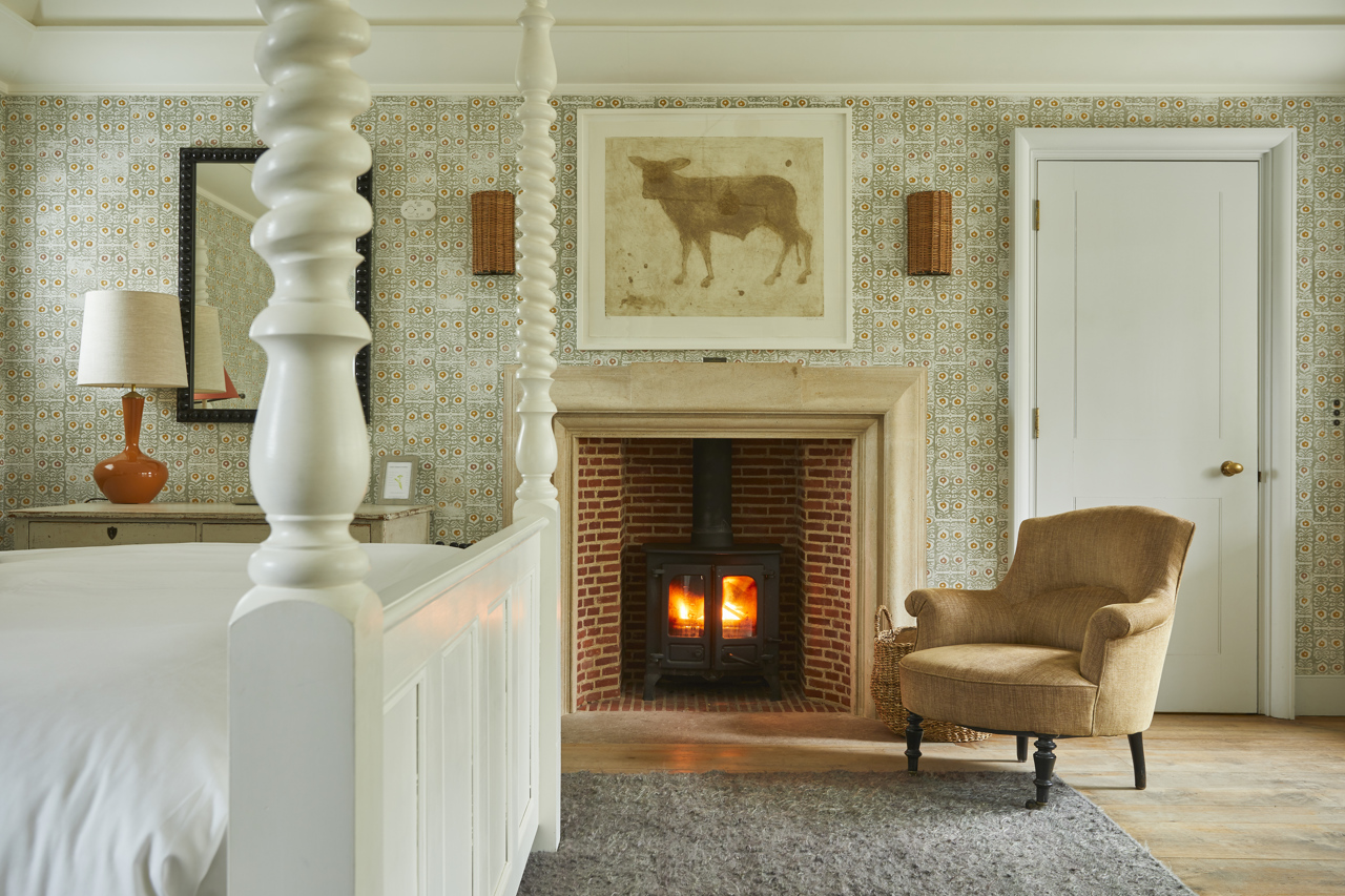 Designed exclusively with couples in mind; an elegant and romantic grownups getaway. The suite reflects the surrounding woodland through its forested wallpaper, with a soft pink ceiling creating an enchanting retreat. Downstairs consists of a spacious lounge with a private terrace and big bar larder. Upstairs, the master bedroom has a super king-size bed with forest views, an en-suite shower room and a roll top bath in the bay window.