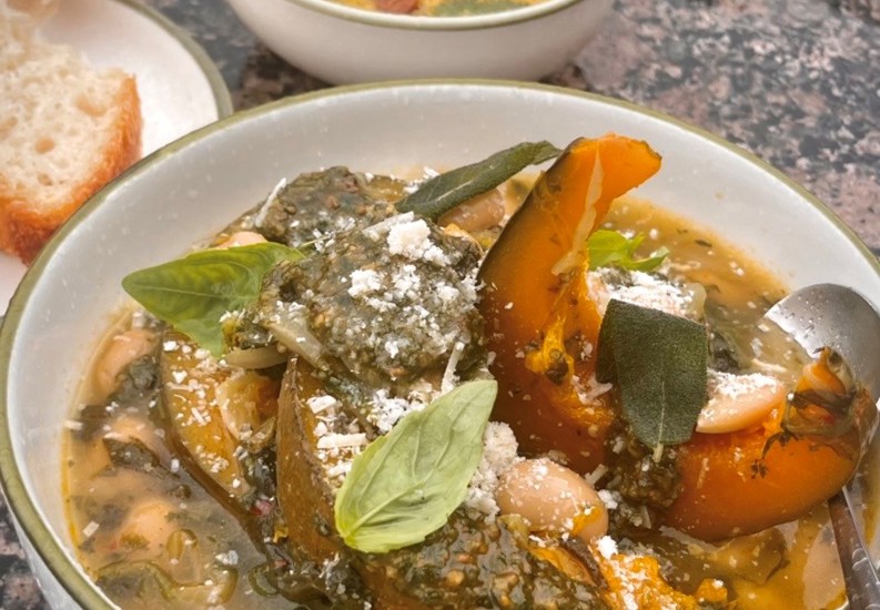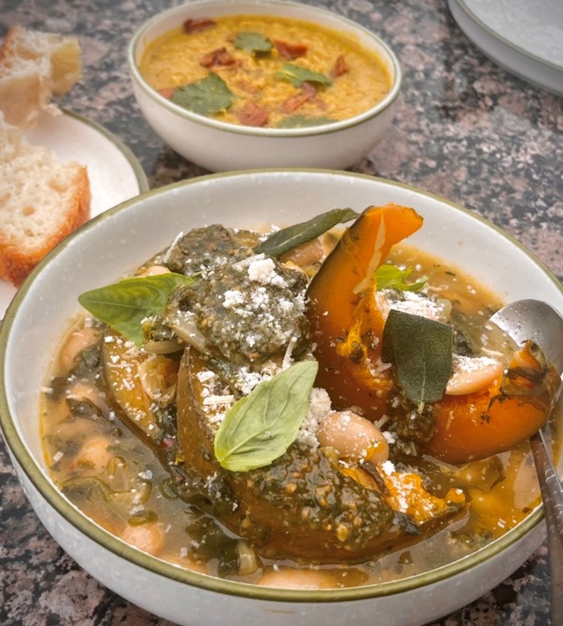 Four Acre Farm’s Muscat squash is still coming through beautifully, and we’re making the most of it in a new seasonal dish: braised with butterbeans and spinach, finished with Pesto alla Genovese and served alongside Hartnett Holder & Co focaccia. It’s comforting, vibrant, and packed with the goodness of the farm.