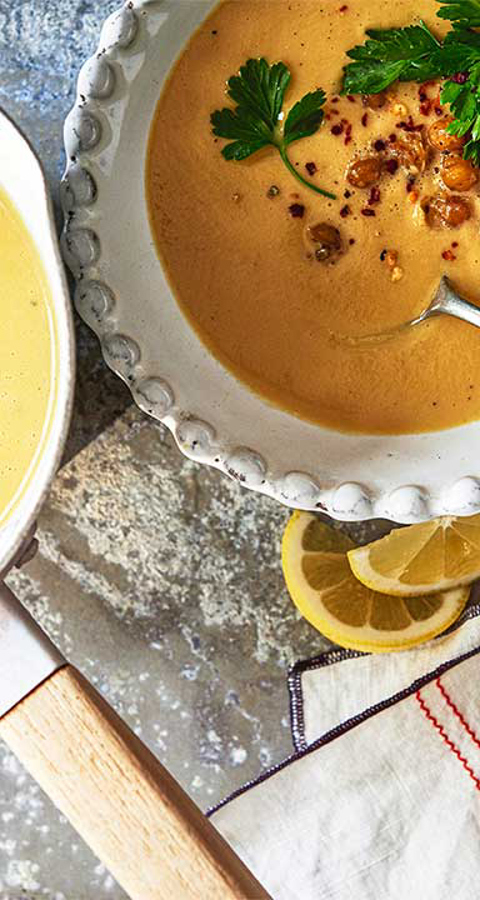 My plant-based version of the classic chicken and lemon soup. Here, chickpeas provide the protein and give a deliciously thick and creamy texture. It will thicken in the fridge, so just warm it up and stir well, to serve. The lemon lends a refreshing lift, perfect for a chilly summer or early autumn evening.