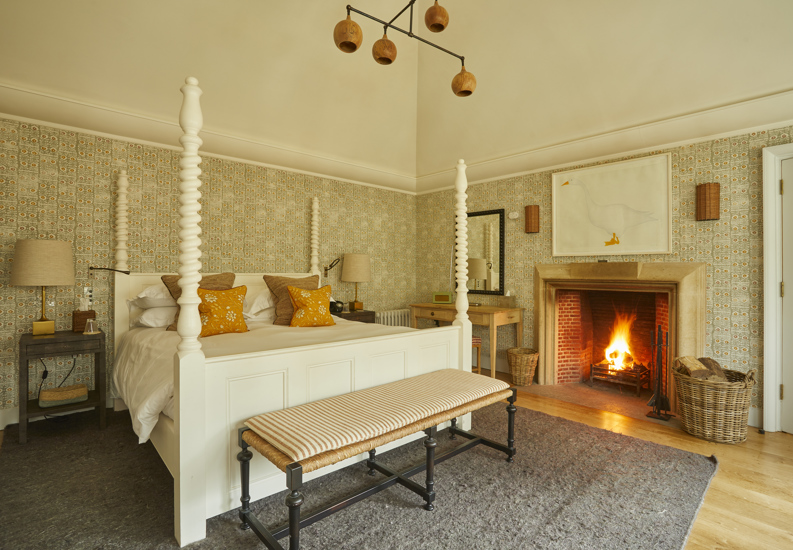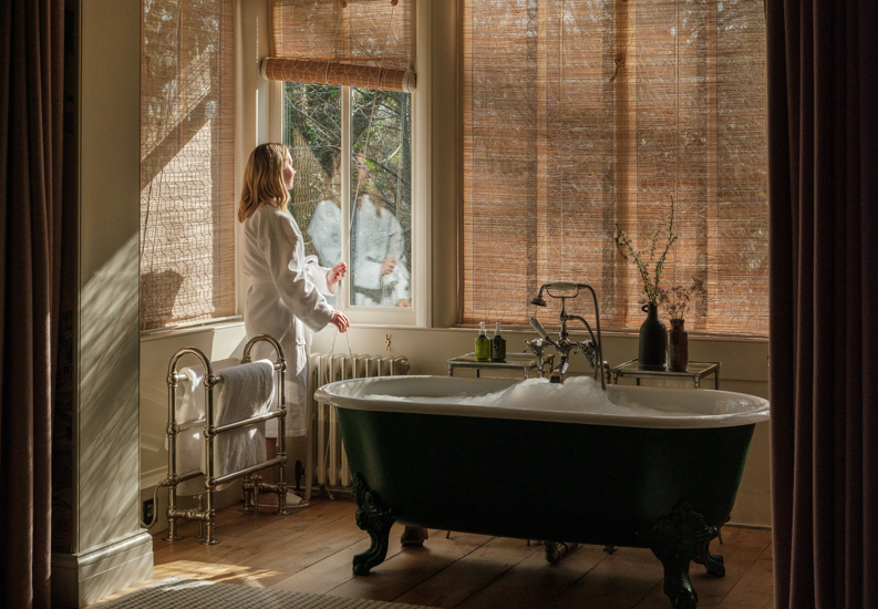 This is one of our most extensive and indulgent suites. Designed over two floors, Crescent Three has a master bedroom with a super king-sized bed and small balcony looking out over the forest and a large bathroom with a roll-top bath and monsoon shower. Downstairs is a lounge with a dining area, cosy fireplace and a private forest terrace, as well as an additional single bedroom. Designer Susie Atkinson used eclectic fabrics and pops of colour in her design.