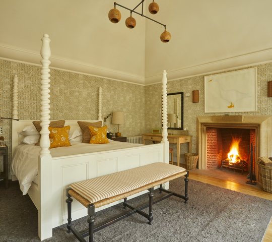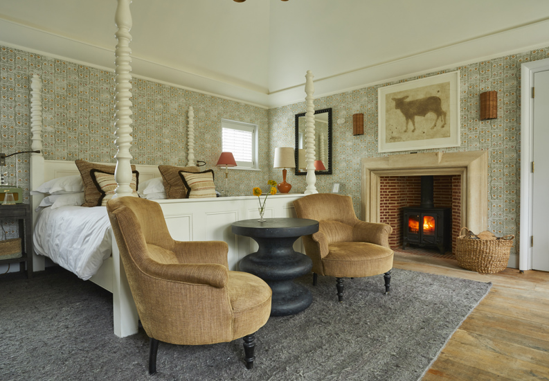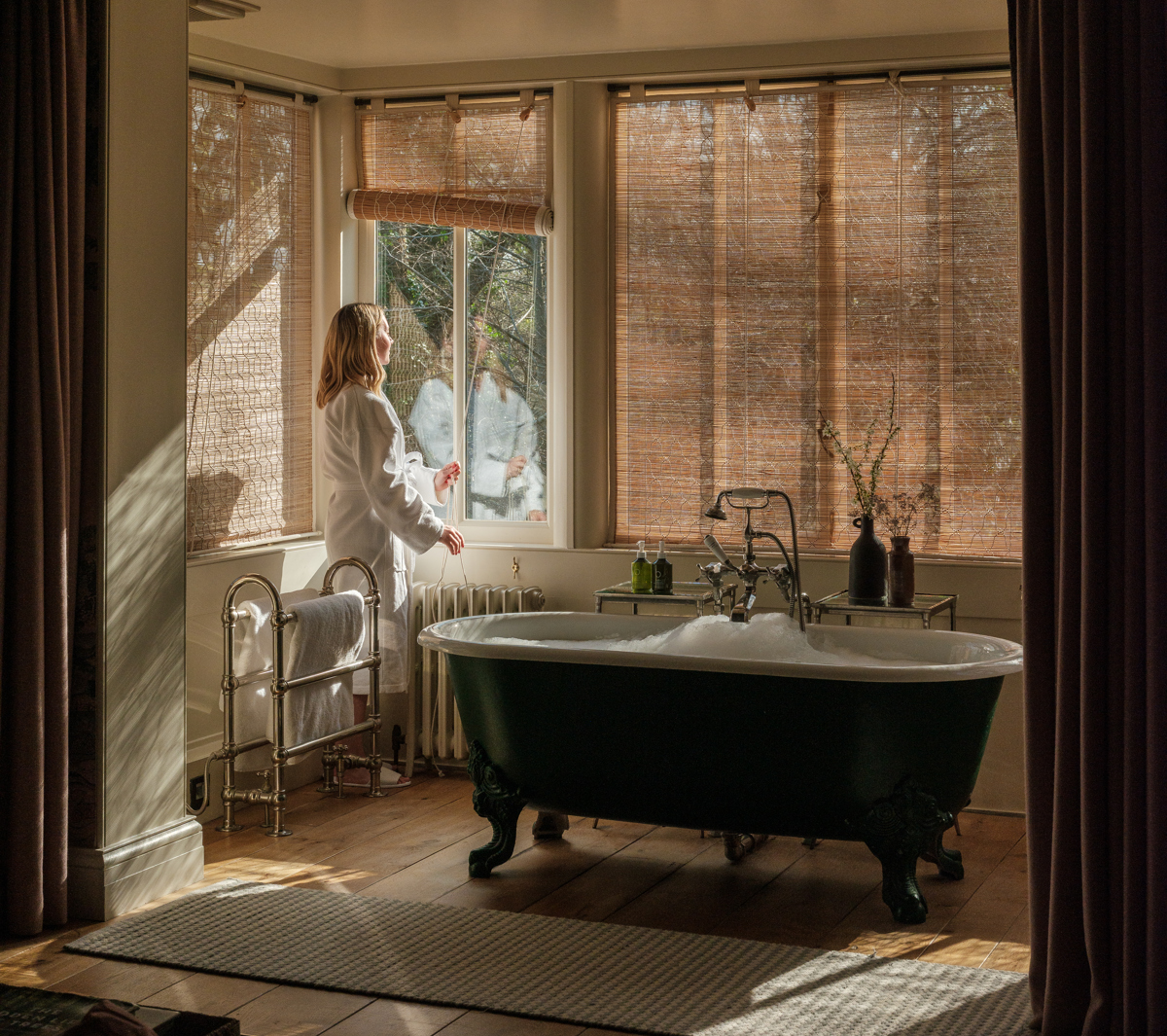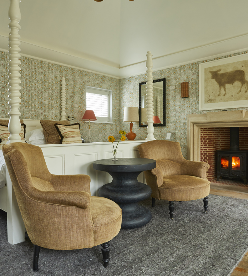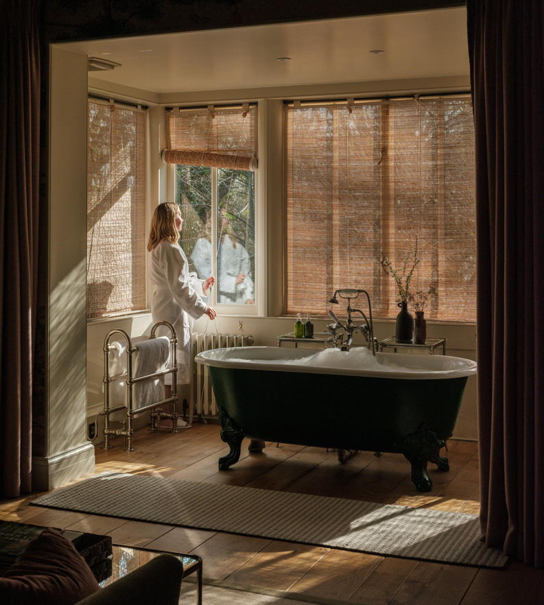 This is one of our most extensive and indulgent suites. Designed over two floors, Crescent Three has a master bedroom with a super king-sized bed and small balcony looking out over the forest and a large bathroom with a roll-top bath and monsoon shower. Downstairs is a lounge with a dining area, cosy fireplace and a private forest terrace, as well as an additional single bedroom. Designer Susie Atkinson used eclectic fabrics and pops of colour in her design.