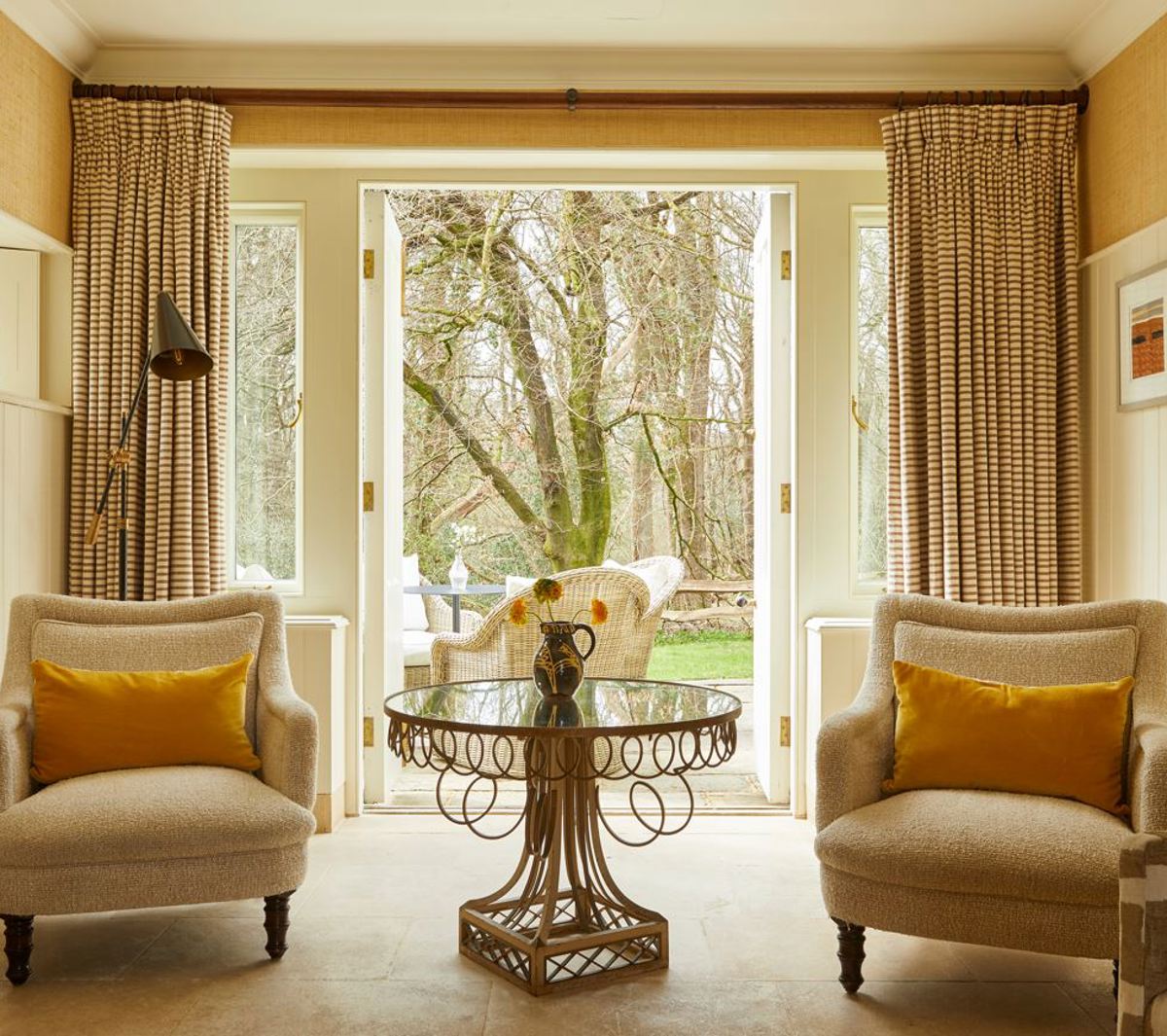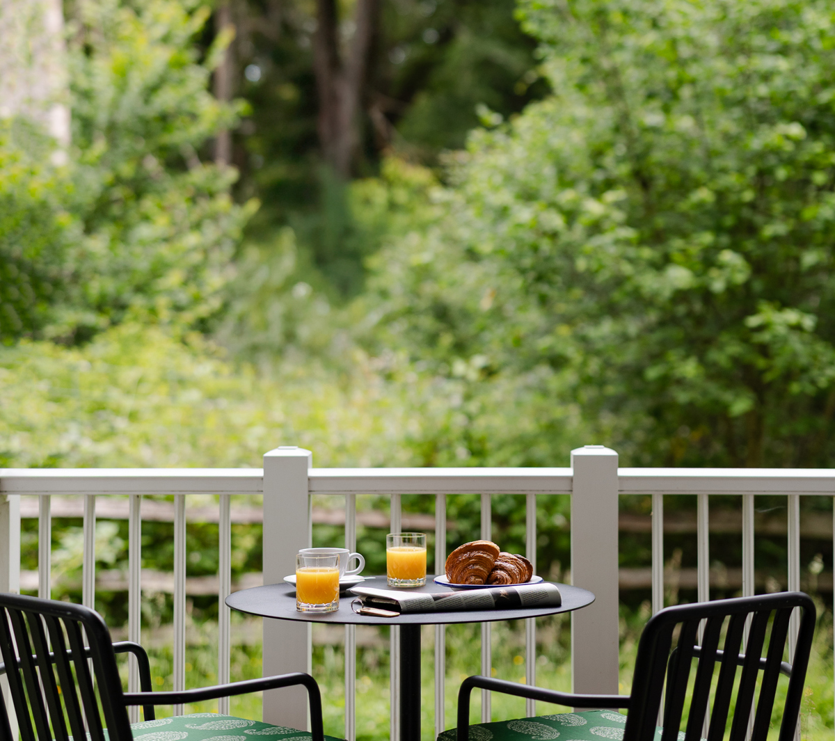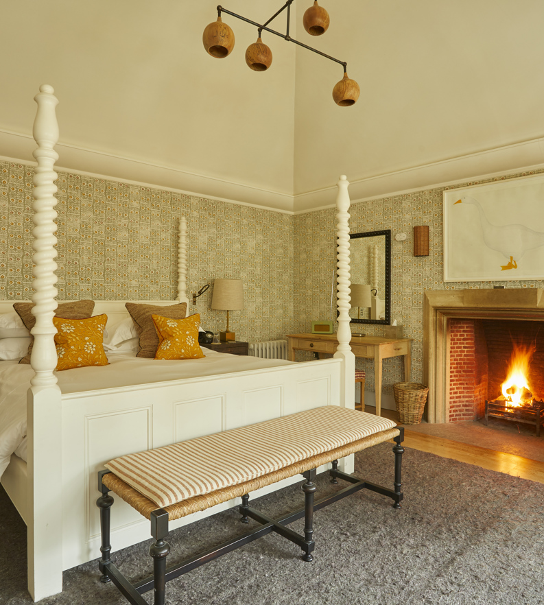 This is one of our most extensive and indulgent suites. Designed over two floors, Crescent Three has a master bedroom with a super king-sized bed and small balcony looking out over the forest and a large bathroom with a roll-top bath and monsoon shower. Downstairs is a lounge with a dining area, cosy fireplace and a private forest terrace, as well as an additional single bedroom. Designer Susie Atkinson used eclectic fabrics and pops of colour in her design.