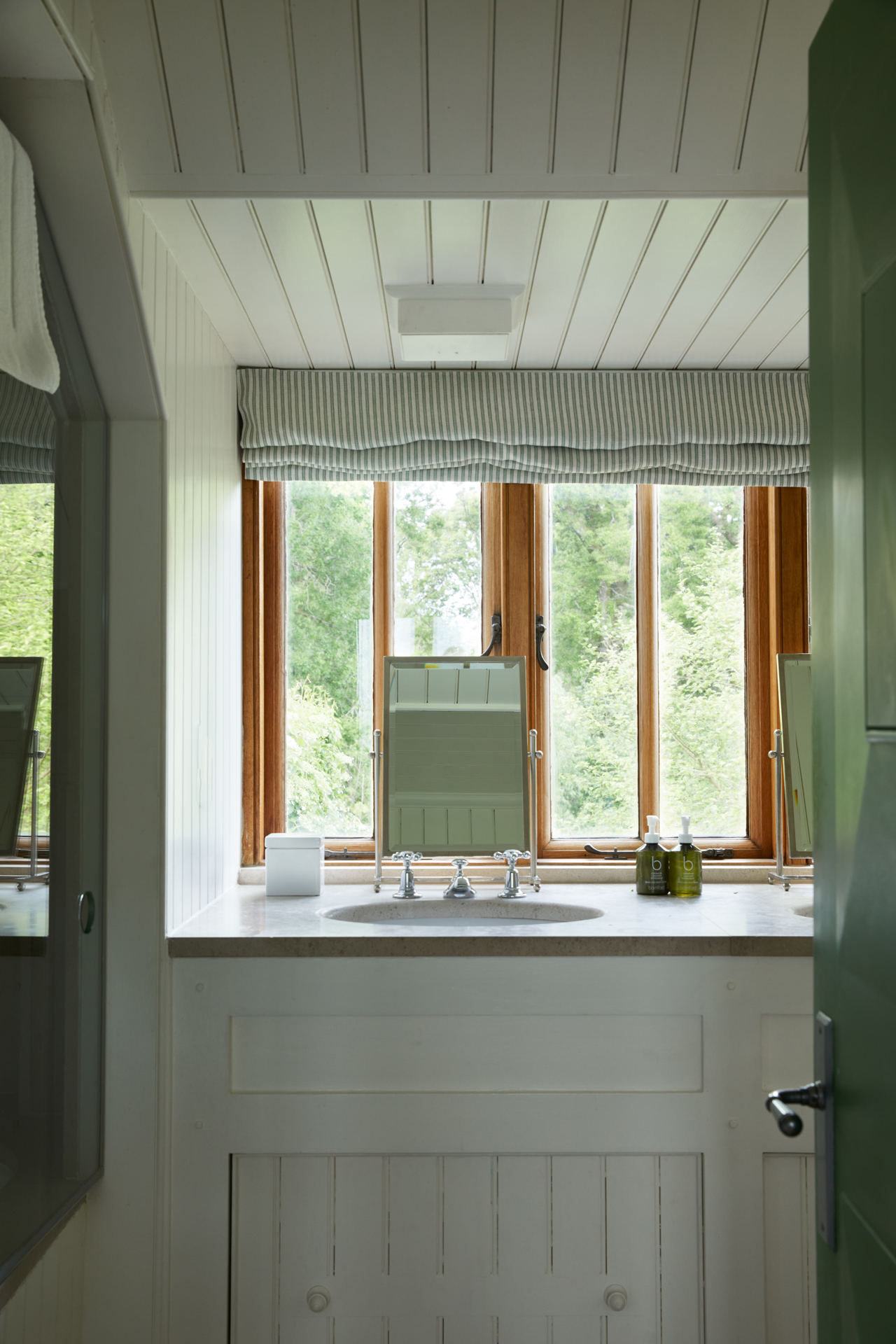 Head upstairs to the mezzanine floor with a super king-sized bed flooded with light by sky lights. The large window in the loft has views over the grounds and forest beyond.
